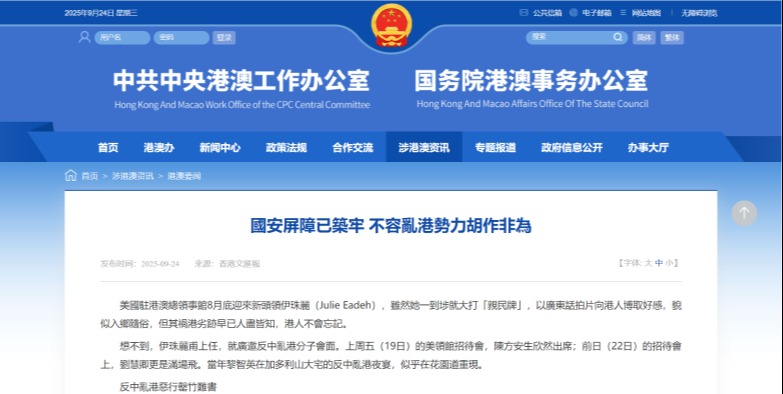 國務院港澳事務辦公室24日發文指,美國駐港總領事伊珠麗(Julie Eadeh)上月履新,有網媒消息指出,她上任後故態復萌,企圖勾結亂港分子陳方安生禍亂香港。多名市民昨日到美國駐港總領事館外抗議,要求美方及相關人員停...