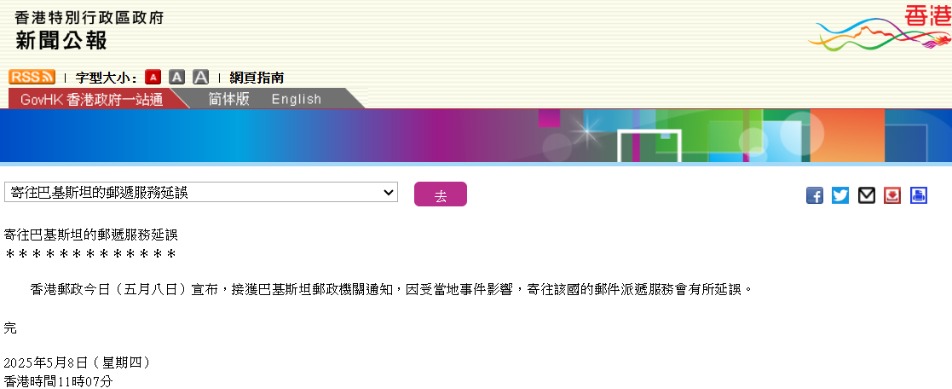 印度與巴基斯坦兩國緊張局勢持續升級。當地時間5月7日,印度向巴基斯坦控制區多處發射導彈,造成多人傷亡。香港郵政8日宣佈,接獲巴基斯坦郵政機關通知,因受當地事件影響,寄往該國的郵件派遞服務會有所延誤。