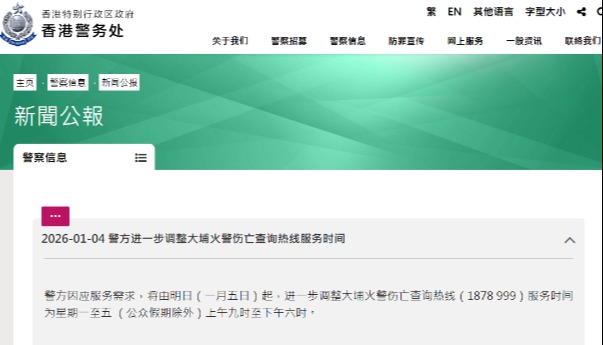 香港警方4日表示,因應服務需求,將由5日起,進一步調整大埔火警傷亡查詢熱線(1878 999)服務時間為星期一至五 (公眾假期除外)上午9時至下午6時。
