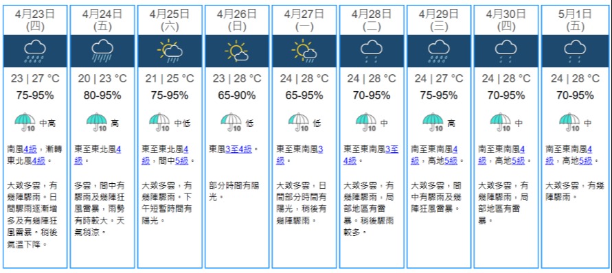 香港天文台22日表示,當日日間炎熱,市區最高氣溫可達30度。但一道冷鋒預料會在23日橫過沿岸地區,天氣漸轉不穩定,有驟雨及狂風雷暴,稍後氣溫下降,氣溫介乎22度至28度;至本周五(24日)部分地區雨勢較大,最低氣溫約...