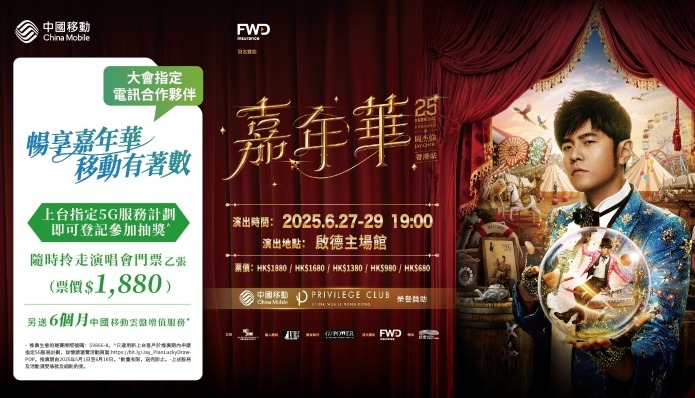 中國移動香港(CMHK)榮譽贊助周杰倫《嘉年華世界巡迴演唱會2025-香港站》倒數兩個月,繼早前推出“CMHKx嘉年華獨家優惠組合”大受好評後,CMHK繼續回應廣大樂迷所需,重磅推出“暢享嘉年華‧移動有著數”抽獎活動...