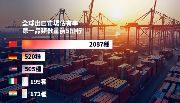 韓國貿易協會旗下國際貿易通商研究院的報告顯示,2024年,擁有全球出口市場佔有率第一品類數最多的國家是中國(2087種),其後依次為德國(520種)、美國(505種)、意大利(199種)以及印度(172種)。