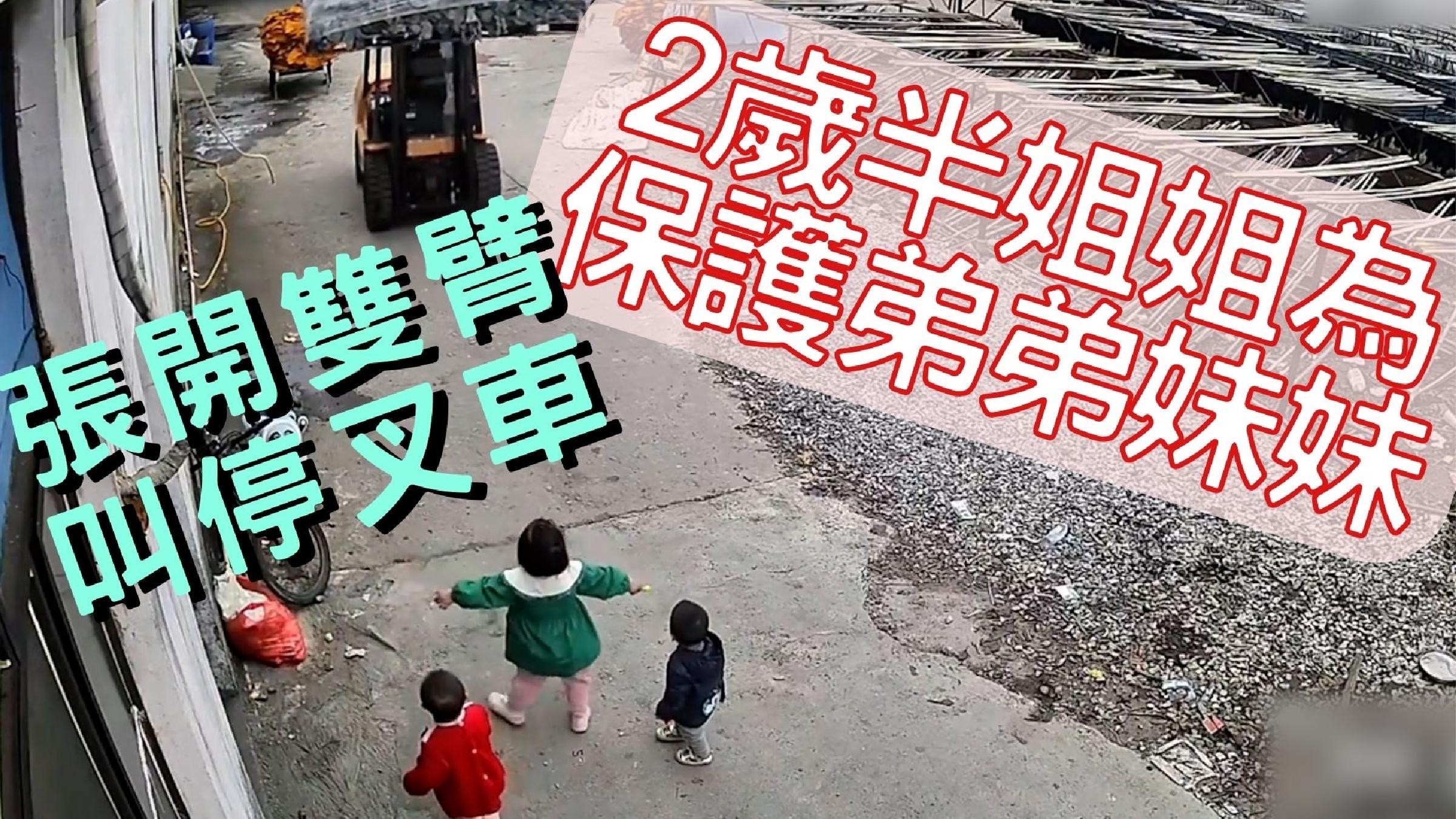 2歲半姐姐為弟弟妹妹安全張開雙臂攔住叉車