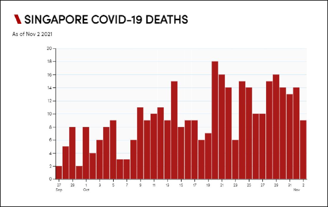 新加坡單日新增確診病例統計 圖源:《聯合早報》 每年會有2000人因新冠逝世 與此同時,新加坡衛生部也為李顯龍的表態提供了支持,暗示雖然新加坡未來也會有新冠死亡病例,但不會比疫情前高。 據《聯合早報》報道,11月1日,新加坡通訊及新聞部兼衛生部高級政務部長普傑立代表衛生部長王乙康發表聲明稱,新加坡目前的新冠死亡率為0.2%,與感染普通肺炎的死亡率不相上下,這比起其他國家在啟動疫苗接種計劃前經歷病例激增時的3%死亡率要低得多。 值得註意的是,新加坡衛生部並不會直接發布每日新增死亡病例人數,僅以“過去28天內確診患者中的死亡人數和死亡率”作為替代。 也就是說,普傑立提出的0.2%死亡率僅指10月4日至10月31日期間確診患者的死亡比例,不包括此前確診但在該期間死亡的病例。 所以,若以該標準計算,新加坡在10月僅有約200例死亡病例,與亞洲新聞臺、《聯合早報》等新加坡媒體的統計結果(312例)存在一定出入。 在被問及這一數據差異時,普傑立也解釋稱,這是因為過去幾個月本地染病人數顯著增加,而多數病患在染疫一段時間後才惡化成重癥,所以最近看到的死亡病例是較早前染病的。