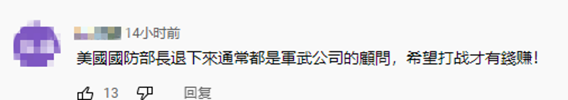 圖源:台媒報道截圖 他放言美國“不會在台灣海峽和大陸對打,因為那就在他們(大陸)旁邊,我們會在我們想打的地方打,而且是他們會輸的地方。” 美前國防部長雖說得信心滿滿,奈何島內網友不買賬。有網友一眼識破卡特用意,直指“美國國防部長退下來通常都是軍事公司顧問,打仗(他們)才有錢賺!”
