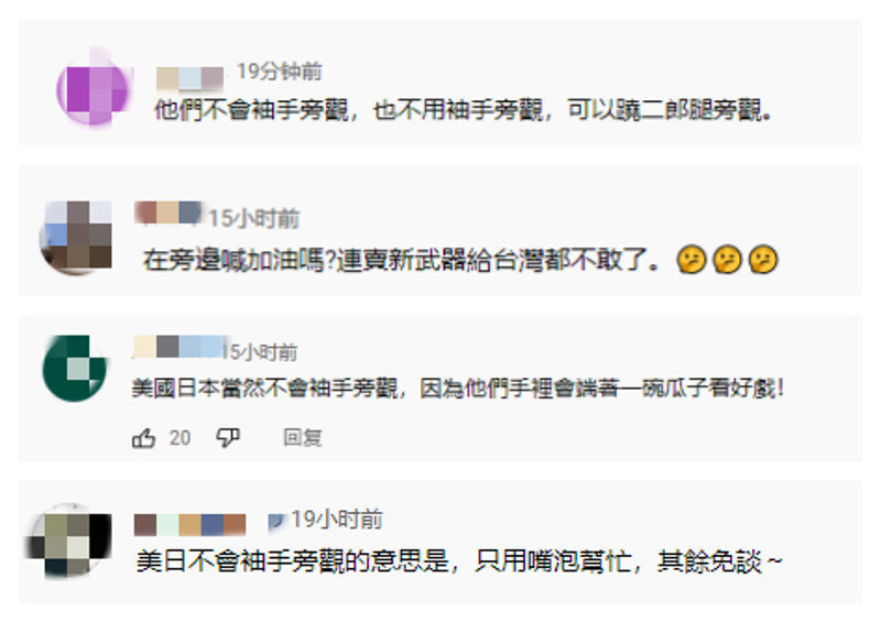 更多的台網友則是對卡特所謂“美國不會袖手旁觀”的言論開啟嘲諷模式。他們諷刺稱, “美國當然不會袖手旁觀,而是會給台灣喊加油!”