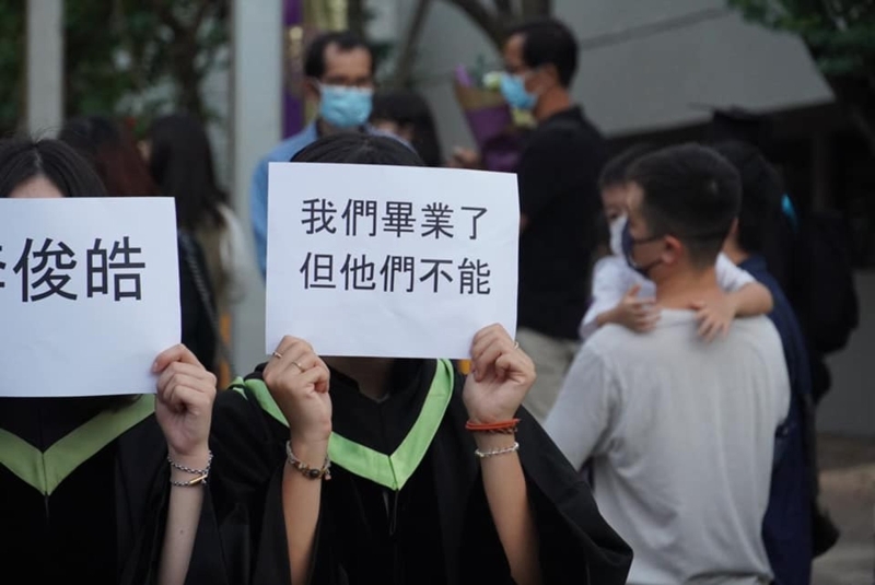 至傍晚,多名畢業生又為因暴動罪而鋃鐺入獄的中大生發起示威。他們在中大百萬大道上舉著寫有獲刑的中大生名字的紙牌,其中一張紙牌寫有“我們畢業了,但他們不能”的標語。這些畢業生舉起紙牌約數分鐘後散去,期間無人制止。