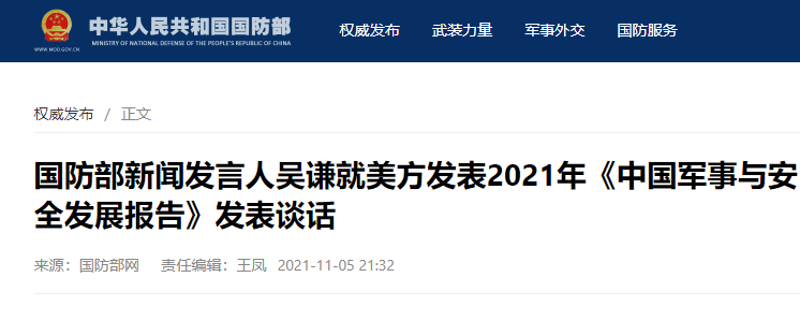 中國國防部正告美方!國雖大,好戰必亡香港新聞網11月6日電 據中國國防部網站消息,國防部新聞發言人吳謙5日就美方發表2021年《中國軍事與安全發展報告》發表談話。他說,報告罔顧事實、充斥偏見,妄議中國國防政策和軍事戰略,中方對此表示強烈不滿和堅決反對。