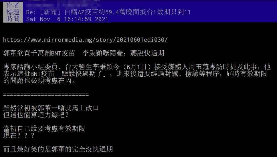在島内網絡論壇“批踢踢實業坊”(PTT)中,更有網友翻出今年6月“指揮中心諮詢委員李秉穎稱郭台銘捐的BNT疫苗快過期”的一則舊聞,諷刺民進黨當局收到“回力鏢”: “當初自己說要考慮有效期限,現在(又接收‘即期品’)???而且最好笑的是郭董的完全沒有快過期……”