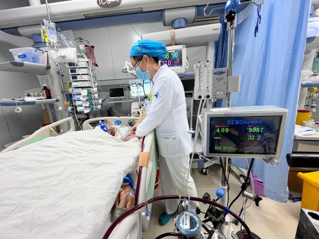 醫護人員使用國產ECMO救治患者(受訪者供圖) ECMO可對重癥心肺功能衰竭患者提供持續的體外呼吸與循環,為搶救贏得寶貴時間。新冠肺炎疫情發生以來,ECMO逐漸為公眾所熟知,然而其核心關鍵技術長期被國外壟斷,設備及耗材價格昂貴。 西安交通大學第一附屬醫院心血管病院院長袁祖貽介紹,該院心血管團隊已從事ECMO臨床應用及相關研究超過20年。團隊是國內最早開展ECMO臨床工作的單位之一,也是國內最早研發膜式氧合器、灌注管路等醫療器械的單位之一。2017年,該團隊聯合有關方面針對ECMO設備全血液接觸面長效抗凝塗層、磁懸浮離心泵、超聲流量探頭、程控監測系統及ECMO膜肺展開深入設計和研發。