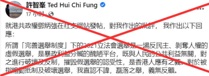 許智峯 香港中通社圖片 面對香港各界的批評,許智峯不僅不悔改,反而發文辯稱自己“完全不違法”,還揚言“會義無反顧地破壞選舉”…… 昨日(8日)晚上,許智峯又在社交媒體發文,污衊香港新一屆立法會選舉是“一場反民主、剝削人權的虛假選舉”,還揚言“對之進行破壞及反制是香港人的應有之義”。對於被指煽動抵制及破壞選舉,他更大言不慚地說自己“義無反顧”。
