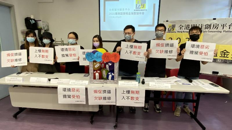 全港關注劏房平台(平台)於今年6月到10月期間再次為“香港劏房租金指數”進行實地測量、親身訪問租戶、批則核實等,訪問葵青、荃灣、深水埗、觀塘、油尖旺及港島區共30個單位,合共60戶房戶,就租金租約和居住面積及環境等多方面進行調査,今日(14日)召開發布會。結果發現劏房租金指數跌幅比私人住宅租金指數少。受疫情影響,經濟環境變差,基層租戶失業及開工不足的情況嚴重。即使租金不變或輕微下調,劏房租戶生活壓力卻有增無減。