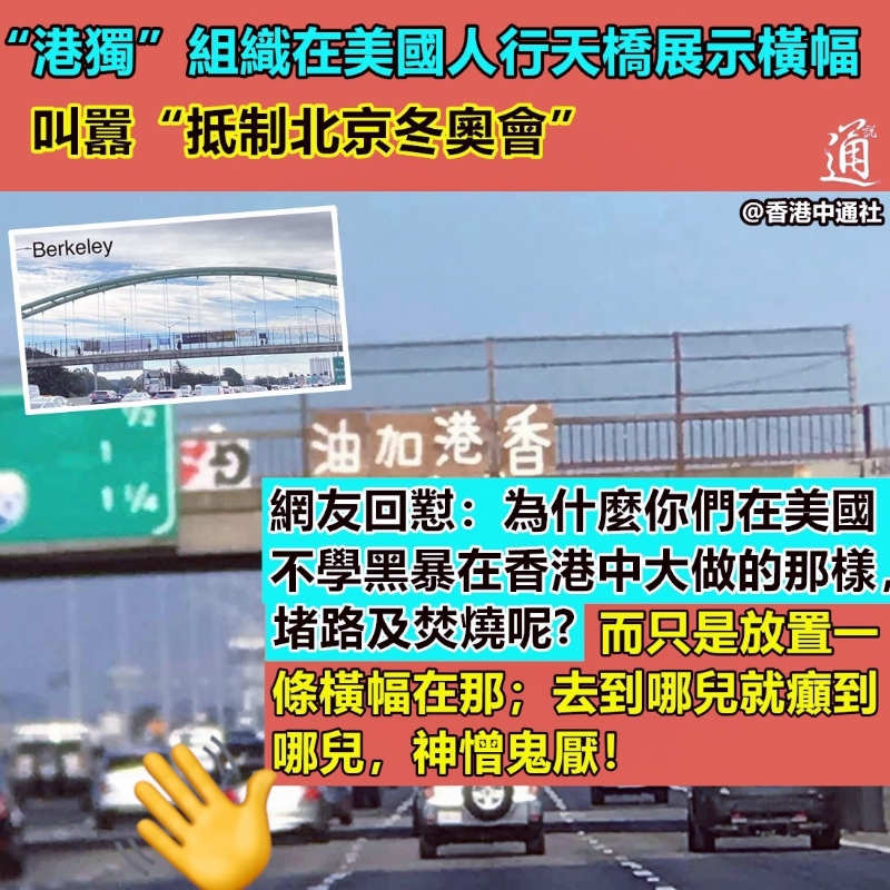 香港新聞網11月15日電 北京冬奧會舉辦在即,反中亂港勢力又伺機蠢蠢欲動,欲“碰瓷”這個國際矚目的賽事以宣揚“港獨”思想。近日, “港獨”組織、旅美港人團體“美國香港人會館”就在美國西部的五座城市、六處地點舉辦了一場所謂“光復freeway(高速公路)”的活動。他們聲稱要通過在橫跨高速公路的人行天橋上展示橫幅的方式,表達所謂“抵制北京冬奧會的理念”。 “美國香港人會館”成員阿瑞塔對外媒聲稱,11月6日中午,他們看到美國何處有橫跨高速公路的人行天橋,“就在上面擺橫幅。”