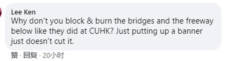 好笑的是,雖然“美國香港人會館”昨日(14日)在社交媒體上“洋洋自得”地分享了此次的“宣獨”照片,但響應者寥寥,有關評論也是質疑聲居多。 香港“修例風波”期間,黑暴分子曾非法占據香港中文大學二號橋,將大量雜物從橋上擲落馬路及路軌癱瘓交通。如今,亂港分子在美國亦試圖借人行天橋搞事,不過“手法”顯然溫和多了! 有網友就在評論區內以英文回懟亂港分子:“為什麽妳們(在美國)不學黑暴在香港中大做的那樣,堵路及焚燒呢?而只是放置一條橫幅在那?”精準地點出亂港分子的醜態——在香港就“高喊民主、作威作福”,在美國卻即刻“龜縮”,只敢“溫和示威”。