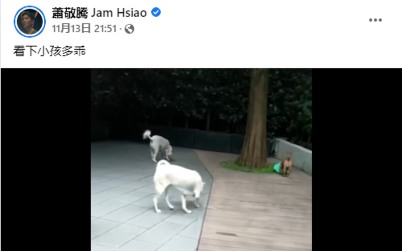 香港新聞網11月16日電 台灣歌手蕭敬騰今年初因為工作的關係前往大陸,目前仍在大陸各地工作。13日,他在社交媒體臉書曬出自家愛犬嬉戲玩耍的影片,並配文稱,“看下小孩多乖”,未料卻引來“台獨”歌手謝和弦強行“碰瓷”。 謝和弦在留言區開嗆稱“看看妳在人民幣前多乖”,疑似不滿蕭敬騰親近大陸、自認是中國人的舉動。