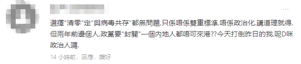 “妳們之前不是鬧政府要‘全面封關’?”部分網友諷刺民主黨“今日的我打倒昨日的我”,“選擇‘清零’還是‘與病毒共存’都沒問題,只要不泛政治化……但兩年前,哪個政黨說要‘封關’,讓一個內地人都不可以來港?”