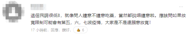 到了今天,針對外防輸入屢現漏洞,港府收緊了有關措施,民主黨又來鬧了,不過就鬧政府防疫政策過於嚴格…… 還有網友表示,“這個民調很弱智,就像問人鐘意不鐘意吃藥,當然都說不鐘意啦。應該問如果放寬限制可能會有第五、六、七波疫情,大家是不是還願意放寬!”