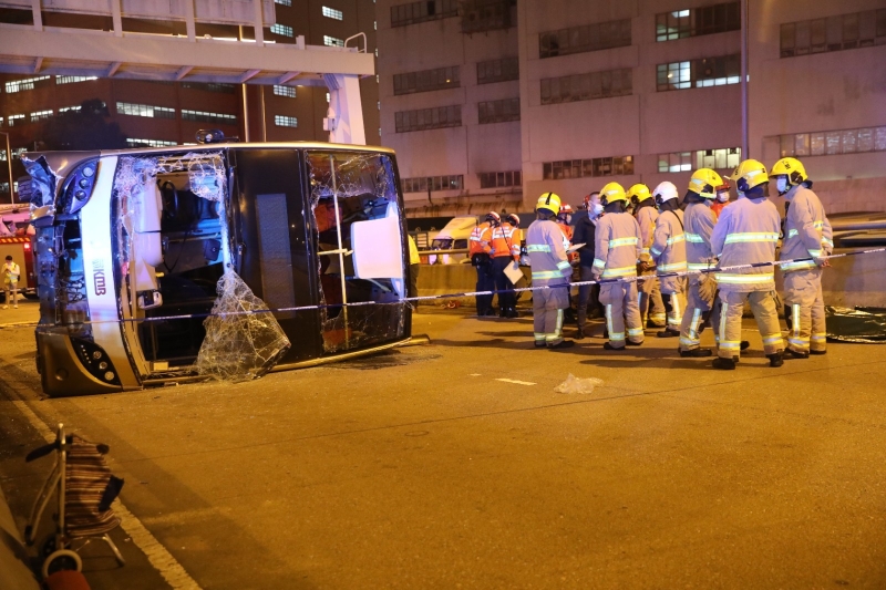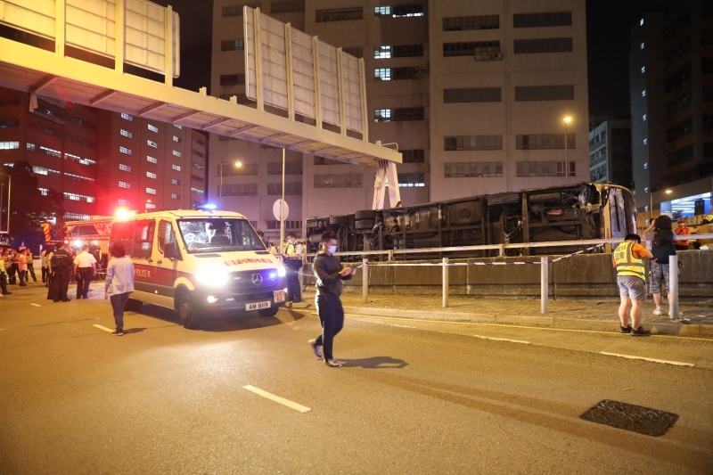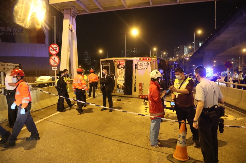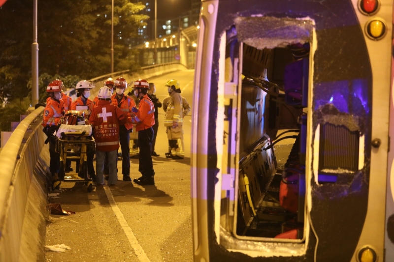 11月18日晚上11時左右,香港大圍成運路上青沙公路的入口發生巴士翻側意外,涉事九巴車頭嚴重損毀,車頭玻璃碎裂。現場1人證實死亡,另有10人受傷,當中1人傷勢較重。(香港中通社記者 謝光磊 攝) 【編輯:紀東】
