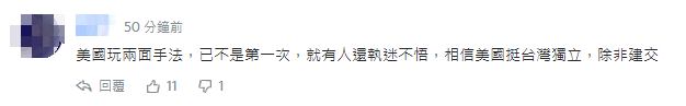 有網友表示,美國玩兩面手法,已不是第一次,偏偏有人還執迷不悟,相信美國挺“台灣獨立”……