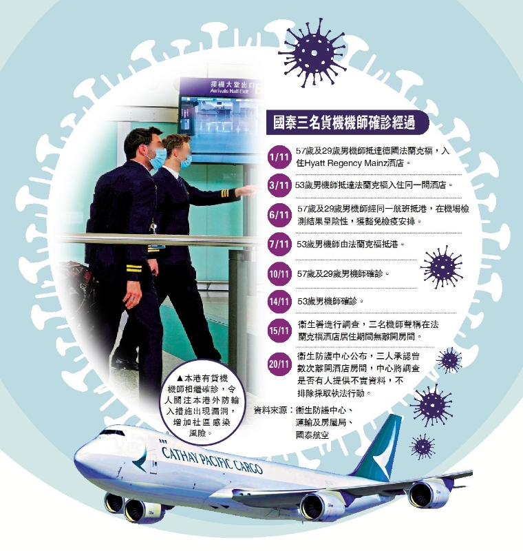 五日內有三名國泰航空貨機機師相繼確診,且都是獲準於返港後豁免隔離檢疫,返回社區後才透過強制檢測發現確診,令人關注本港外防輸入措施出現漏洞,增加社區感染風險。 三名機師(第12376、12378、12387宗)於本月初先後抵達德國法蘭克福,並入住國泰安排的同一間酒店,其後他們陸續返港並先後確診。 香港衞生署早前調查時,他們均聲稱在酒店居住期間沒有離開房間,互相沒碰面,也沒有參加任何聚集活動,而三人的病毒基因排序幾乎一致,顯示酒店極可能是他們唯一的共同感染途徑(詳見上圖)。 三機師曾離酒店會友 不過,國泰上周四(11月18日)交給政府的調查報告披露,三名機師在外站停留期間無遵守閉環式管理要求。 衞生防護中心11月20日公佈,因應國泰航空調查報告的結果,中心向三人跟進他們在法蘭克福外站停留期間的日程。 三人承認曾數次離開酒店房間,以及到訪酒店附近的地方,而該三人亦曾於酒店外見面或與朋友會面。 據瞭解,貨機機組人員抵港後可獲豁免隔離檢疫,前提是機組人員必須遵從閉環式管理措施。而該三名貨機機師在法蘭克福期間違反閉環式管理規定,理應不符合豁免隔離檢疫資格。 消息稱,若隱瞞行蹤而影響防疫工作,可能違法。翻查資料,本港首宗社區出現新冠肺炎變種病毒的個案,從迪拜抵港的印度裔男子和其在本港的女友,涉嫌於今年四月向衞生防護中心提供虛假資料,隱瞞曾參與聚會,兩人其後被拘捕檢控,並於7月分別被判囚3個月及20日。 衞生防護中心表示,會進一步調查是否有人違反《預防及控制疾病(披露資料)規例》(第599D章),提供不實資料以影響公共衞生調查工作,並會按需要採取執法行動。 大律師陸偉雄接受采訪時表示,政府未必能就機師在德國的行為提出檢控,但如果有人抵港時作出相關聲明,例如聲稱有遵從法例要求在外國進行閉環式管理,便有可能違反虛假聲明等條例。 行政會議成員黃國健表示,三名機師破壞防疫規定,對社會造成很壞的影響,不僅連累同事和公司,更令人擔心影響內地與香港通關的信心。若調查發現有人違例,應依法處理。至於國泰航空,雖然法律上可能難被追究責任,但國泰應吸取教訓,改善員工的管理和紀律問題。 德國衞生當局表示,調查顯示當地沒有錄得與該酒店相關的確診個案,該酒店並沒有已知的群組爆發,因此推斷三名確診機師是在酒店外感染。 111機組人員準離檢疫中心 130名貨機機師亦受這三名確診機師牽連,因曾於德國入住同一間酒店,早前被送入檢疫中心。 中心昨日稱,其中111名仍在檢疫的機組人員,11月20日獲準離開,其餘10名密切接觸者則需繼續接受檢疫。據瞭解,另有10人早前已完成檢疫離開。 呼吸系統專科醫生梁子超說,政府應交代三名確診機師的可能感染源頭,例如是否一同參與某些活動、或到過什麼高危場所。 【編輯:許豐悅】