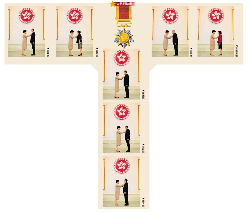 首日的典禮上,頒授勳銜及獎狀予出席的157名受勳人士。受勳人士中,7人接受大紫荊勳章,18人接受金紫荊星章,1人獲追授金英勇勳章(由家屬代領),21人接受銀紫荊星章,4人接受銀英勇勳章,17人接受紀律部隊及廉政公署卓越獎章,39人接受銅紫荊星章,4人接受銅英勇勳章。 今年共有7人獲頒大紫荊勳章,包括終審法院首席法官張舉能,律政司司長鄭若驊,行政會議成員周松崗、葉劉淑儀,港區全國人大代表陳振彬,全國政協常委、粵港澳大灣區企業家聯盟主席蔡冠深,全國僑聯副主席、中國和平統一促進會香港總會理事長盧文端。 參與抗疫獲獎者眾 18名獲頒金紫荊星章的人士包括行政會議成員黃國健,經民聯主席盧偉國,前高等法院上訴庭副庭長楊振權,前高等法院上訴庭法官麥偉德,前勞工及福利局常任秘書長張琼瑤,前民政事務局常任秘書長謝凌潔貞,前食物及衞生局常任秘書長容偉雄,西九管理局行政總裁馮程淑儀,前環境局常任秘書長兼環境保護署署長鄭美施,前發展局常任秘書長(工務)林世雄,九龍社團聯會會長王惠貞,僱員再培訓局主席余鵬春,香港國際社會服務社行政總裁邱浩波,基本法委員會委員陳弘毅,香港深圳社團總會會長鄧清河,恒基兆業地產集團執行董事李家誠,中國和平統一促進會香港總會會長姚志勝,前刑事檢控專員江樂士。 還有165人獲得行政長官社區服務獎狀,335人獲得行政長官公共服務獎狀。 港府早前表示,為表揚各界人士過去一年就應對新冠肺炎疫情及相關工作的貢獻,今年獲頒授行政長官社區服務獎狀及行政長官公共服務獎狀這兩個獎項的人士特別多。 林婉儀獲追授金英勇勳章 在今年的授勳名單中,已故水警總督察林婉儀獲追授金英勇勳章。而獲頒銀英勇勳章的四名警務人員中,有人曾在修例風波期間被暴徒襲擊受傷,有人成功處理了香港史上最嚴重的爆炸品案。