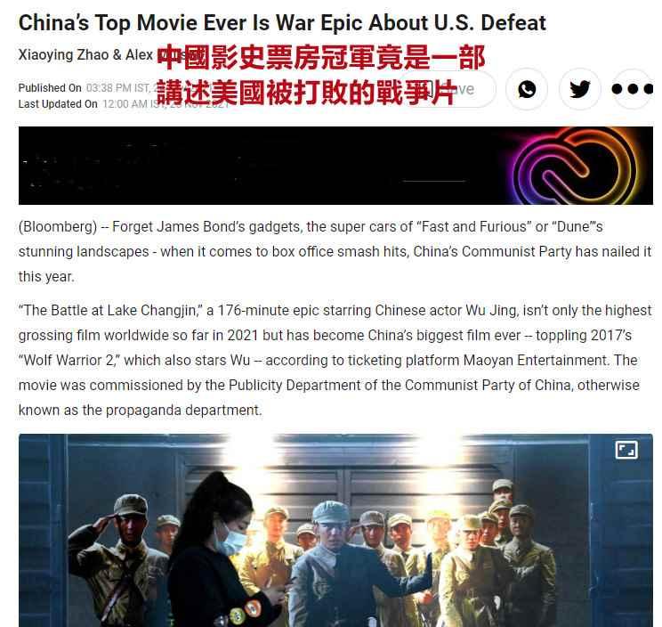 彭博社報道截圖 當地時間11月24日,彭博社發表文章:《中國影史票房冠軍竟是一部講述美國被打敗的戰爭片》。 這家媒體一是抱怨中國觀眾對電影的喜好發生了變化,已不再像過去那樣追捧好萊塢大片。文章稱,與《長津湖》在中國市場的火熱程度相比,同期上映的《007》、《速度與激情》、《沙丘》等好萊塢大片的影響力簡直不值一提。 二是對中國觀眾愛看美軍被打敗而“感到不快”。報道稱,《長津湖》上映於中美關係持續緊張多年之際。它講述了上世紀50年代中國人民志願軍打敗美軍,并將其逐出朝鮮的真實故事。美國人已幾乎忘記這段歷史,《長津湖》卻“舊事重提”,且傳播效果顯著,成為中國電影史上的票房冠軍。 報道還說,這還不算完,中國的導演正在製作《長津湖》的下一部——《長津湖之水門橋》,這部電影依舊是講述志願軍將美軍趕出朝鮮的故事。 【編輯:王一冰】