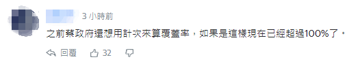 有網友諷刺,“又是超前計算方式?真的是全世界比不上?”、“之前蔡政府還想用劑次來算(疫苗)覆蓋率,如果是這樣現在已經超過100%了”。