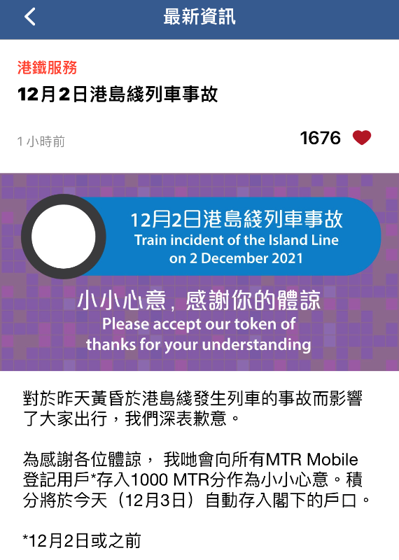 港鐵今日(3日)表示,對於昨天(2日)傍晚於港島線發生列車的事故而影響了市民出行,深表歉意。為感謝體諒,今日向所有MTR Mobile登記用戶存入1000 MTR分,作為小小心意。