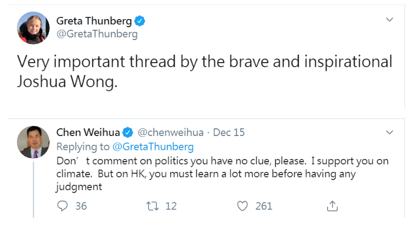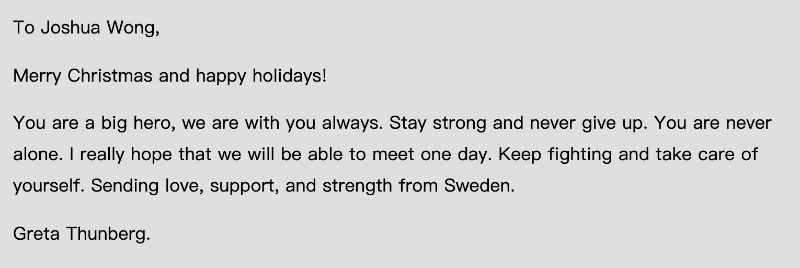 香港新聞網12月3日電 有“瑞典環保少女”之稱的通貝里(Greta Thunberg)近日又和亂港分子黃之鋒隔空互動了。通貝里這次向獄中的黃之鋒寫信,大讚他為“大英雄”,引來網友忍不住回懟:“在香港搞事都叫大英雄?黃之鋒是大狗熊才對!”