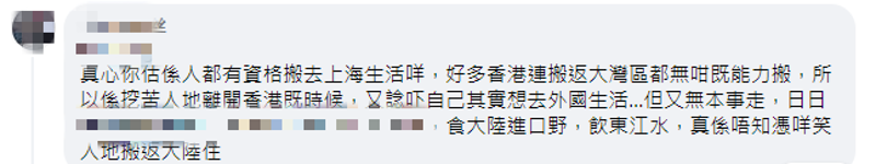 也有網友直斥這些“黃絲”“反中上腦”、“政治掛帥”,質疑一個中國人從中國香港移居到中國上海有何不對? “在香港吃內地食物、喝東江水,有什麼資格嘲笑別人搬去內地住?”還有網友揶揄 “黃絲”“反中反到失智”!