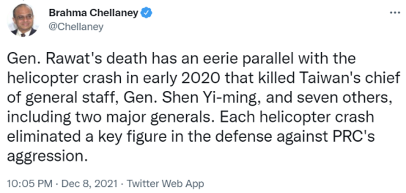 (印度电视画面:失事直升机残骸) 正當印度官方調查緊鑼密鼓進行之際,在印度國內卻有對華鷹派學者布拉馬·切拉尼出來“帶風向” ,將印度最高將領遭遇空難事件與2020年台軍“參謀總長”沈一鳴墜機事件相關聯,並指向中國陰謀論。