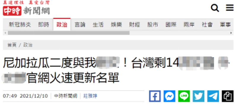 台媒截圖 報道稱,尼加拉瓜宣佈與台灣斷絕“外交關係”後,根據台外事部門官網最新資料顯示,台灣“邦交國”則有馬紹爾群島共和國、瑙魯、帕勞、圖瓦盧、斯威士蘭、梵蒂岡、伯利茲、危地馬拉、海地、洪都拉斯、巴拉圭、聖基茨和尼維斯、聖盧西亞、聖文森特和格林納丁斯,總計14國。 報道提到,此次并非尼加拉瓜第一次和台灣“斷交”,第一次為1985年12月17日中止“外交關係”,并於1990年11月5日“複交”。此次相隔36年。 (完) 【編輯:李冉】