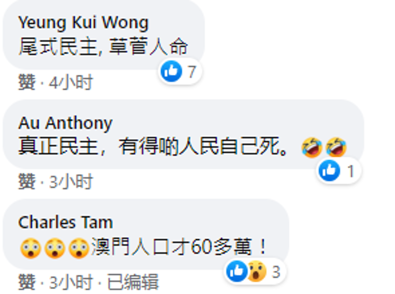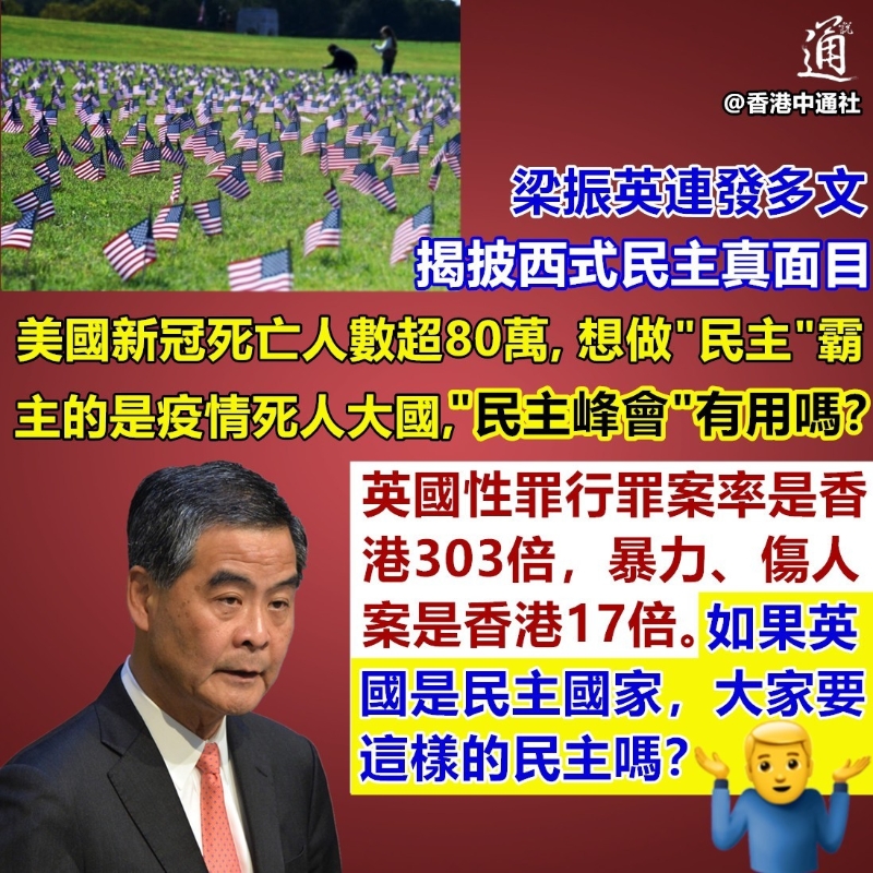 (製圖 劉春) 他還提醒移英港人“出入要小心,在家更要小心。” 梁振英揭發西式民主真面目的多篇帖文連日來引發香港網友附和、點贊。有網友對美國死於新冠的人數大感吃驚,直言“澳門人口才60多萬!”這80多萬逝去的生命顯然是對美式民主最大的嘲諷! 不少網友一針見血地說,“自稱最自由、最民主、最有人權的國家,治安與生存權(卻)最無保障”“美式民主,草菅人命”。 也有網友揶揄西方:“真正民主,就是由得人民自己死”“民主標準由他們(西方)定,他們說是民主就是民主嘍”。