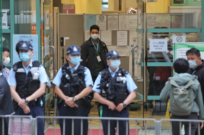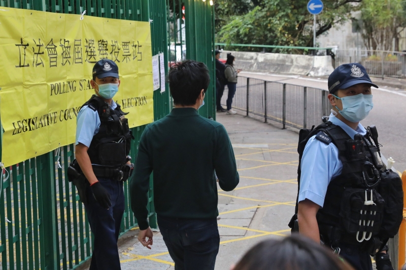 圖為當日,香港警察在位於香港羅便臣道2號高主教書院的投票站執勤,現場秩序井然。(香港中通社記者  謝光磊 攝)