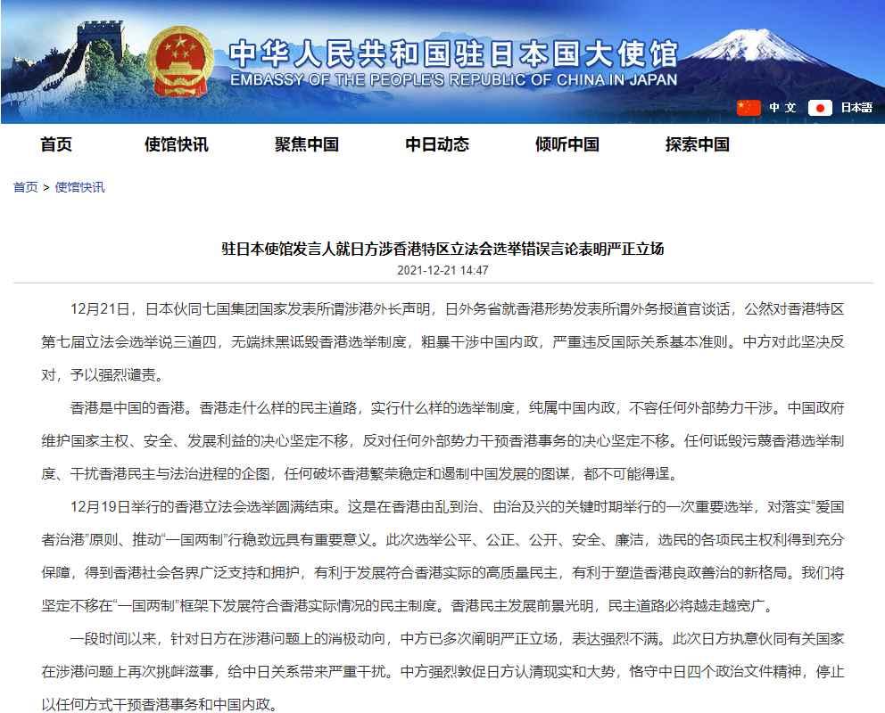 香港新聞網12月21日電 據中國駐日本大使館網站消息,12月21日,日本夥同七國集團國家發表所謂涉港外長聲明,日外務省就香港形勢發表所謂外務報道官談話,公然對香港特區第七屆立法會選舉說三道四,無端抹黑詆毀香港選舉制度,粗暴干涉中國內政,嚴重違反國際關系基本準則。中方對此堅決反對,予以強烈譴責。