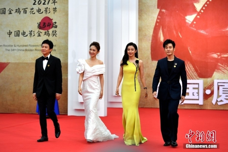 12月30日晚,第34届中国电影金鸡奖红毯仪式在福建省厦门市举行。图为邓超、蓝羽、李冰冰、黄晓明(从左至右)亮相红毯仪式。 中新社记者 吕明 摄 張譯憑藉《懸崖之上》斬獲最佳男主角,張小斐以《你好,李煥英》摘得最佳女主角桂冠,范偉、朱媛媛分別獲得最佳男女配角,張藝謀獲最佳導演,最佳故事片頒給了《守島人》,評委會特別獎授予《我和我的家鄉》。