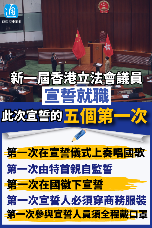 香港新聞網1月3日電 新一屆香港立法會議員於今日(3日)上午11時宣誓就職,過往多屆均由立法會秘書長監誓,但自立法會去年10月修訂《議事規則》,新一屆立法會起,90名議員不再於任期的首次會議上宣誓,改為由特首親自為議員監誓。 立法會人員早前根據《國旗及國徽條例》,將舉行宣誓儀式的議事廳上的區徽暫換成國徽。宣誓儀式上會先奏唱國歌,候任議員面向五星旗和區旗肅立及一同唱國歌,再逐一到台前宣誓。 宣誓順序按照議員年資而定,如年資相同則按照中文姓名筆畫排序。首5名宣誓的議員依次是自2000年起出任議員的飲食界張宇人,其後是商界(第一)議員林健鋒、梁君彥、李慧琼及陳克勤,而最後一名宣誓的則是立會新丁嚴剛。 上一屆立法會有議員因宣誓風波被褫奪資格。政府早前發出宣誓須知,提醒議員必須準確、完整、莊重地宣讀法定誓言;如果故意宣讀內容不一致的誓言,或以任何不真誠、不莊重的方式宣誓,也屬於拒絕宣誓,將即時喪失議員資格。監誓人對不符合全國人大相關解釋及本港法律規定的宣誓,會確定為無效,並不得重新安排宣誓。 政府又提醒宣誓人必須穿着商務服裝,服飾應整齊得體,穿着不恰當的服飾,或展示政治化標誌、口號或標語的衣物/配飾/口罩,會被監誓人視為違反真誠及莊重宣誓的要求,拒絕有關人士進行宣誓,並不會重新安排宣誓。 而疫情下,所有參與宣誓儀式的人員均須全程佩戴口罩。