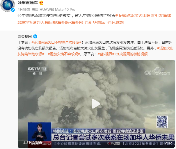 “領事直通車”微博截圖 當地時間14日和15日,南太平洋島國湯加一座海底火山連續兩次劇烈噴發並引發海嘯,環太平洋多國發佈海嘯預警。 聯合國秘書長古特雷斯15日通過發言人發表聲明,對湯加海嘯深表關切。他表示,聯合國願意隨時提供支持。 聯合國說,由於湯加通信網絡受到嚴重干擾,目前還沒收到關於人員傷亡或損害範圍的報告。 據湯加地質局消息,位於湯加首都努庫阿洛法以北約65公里處的洪阿哈阿帕伊島14日開始火山噴發,大量火山灰、氣體與水蒸氣形成巨大雲團。另據當地媒體報道,洪阿哈阿帕伊島海底火山15日發生第二次劇烈噴發,火山灰柱直徑約5千米、高20千米,籠罩在火山上空。截至15日夜間,火山灰還在不停落下,當地通信網絡受到干擾。 【編輯:王瑶】