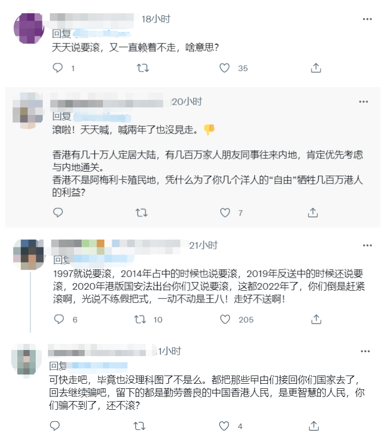 BBC報道截圖 或是自己都覺得單說“防疫過嚴”站不住腳,BBC又開始老調重彈,將話題轉移到香港國安法上。 報道引述問卷結果抹黑稱,接近60%的受訪者認為,過去一年香港的法治情況“有所惡化”,超過八成的企業表示感受到香港國安法影響,而這種感受主要來自“員工士氣”和“移民導致員工流失”方面。 不過,報道亦承認,企業“對未來兩年在港發展前景相對樂觀”。 BBC“陰陽怪氣”的報道一出,立刻引發不少網友討論。 在該報道的推特評論區,針對西方所謂“香港防疫嚴格”的指責,有網友反駁道,有幾十萬香港人定居內地,亦有幾百萬香港市民有和內地往來的需要,香港收緊內外防疫措施,當然是為了爭取與內地“通關”。“香港不是美國殖民地,憑什麼為了幾個洋人的自由犧牲幾百萬港人的利益?” “天天喊,喊兩年了也沒見走。”也有網友嘲笑,外媒不厭其煩地炒作“外資撤離香港”的報道儼然已成“狼來了”的故事——“BBC口中的眾多外國企業和外籍人士,在1997年(香港回歸時)就說要走,2014年非法‘占中’的時候也說要走,2019年‘修例風波’的時候還說要走,2020年香港國安法出台又說要走,這都2022年了,你們倒是趕緊走啊,光說不練假把式,走好不送啊!” 還有網友直言:“快走吧,畢竟也沒利可圖了不是嗎……都把那些亂港分子們接回你們國家去了,回去繼續騙吧,留下的都是勤勞善良的中國香港市民,你們騙不到了,還不走?”