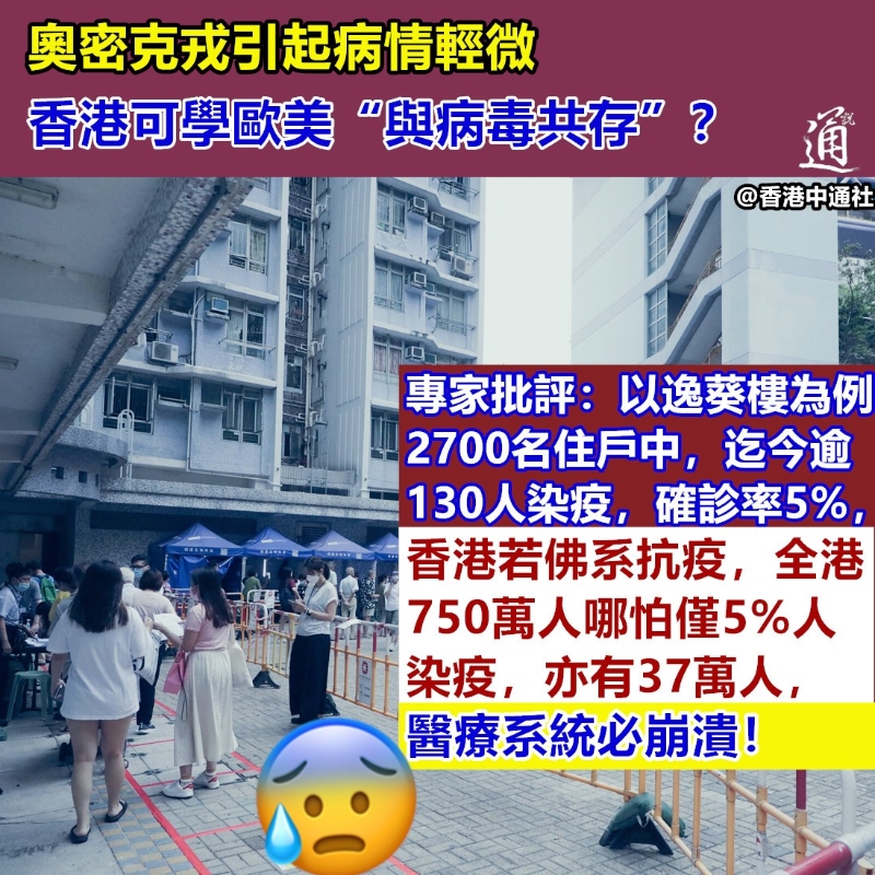 (製圖 劉春) 葵涌邨逸葵樓5%居民染疫,若香港躺平式抗疫,香港將有大量樓宇成為“逸葵樓翻版”。據香港文匯報報道,呼吸系統專科醫生梁子超受訪時指出,Omicron傳染力極強,若不繼續實施“動態清零”策略,堵截病毒傳播,全香港染疫人口或不止5%,“歐美有地方‘與病毒共存’,感染率達六成,澳洲現時每日新增10萬宗個案,香港若然全面失守,每日會有上千甚至上萬人受感染,醫療系統一定崩潰。” 他指出,醫療系統一旦失守,將有大量確診者未能入院治療,屆時便要調整服務,徵用社區中心及學校等作為治療中心接收輕症人士。香港人口老化,年齡中位數為45歲,有不少老人和長期病患,且老人疫苗接種率低,會有不少人染疫後出現重症,仍要在醫院治療,但要確保氧氣供應充足,“如果氧氣不夠,入院也無補於事。” 他指出,即使是輕症者康復後也“手尾長(後果很多)”,“病毒可能長期遺留在人體的腦部及心臟而引致後遺症,現時仍未知出現後遺症的情況和比率。” 故他認為,香港除了仍要堅持“動態清零”外,還要加快為老人接種疫苗。 梁子超還認為,“與病毒共存”會引起社會動盪,經濟民生停擺,直言港人不應幻想“與病毒共存”,“歐美等地與病毒共存,是要付出慘烈代價,南非雖然有人感染病毒後自然免疫,但全國死了30萬人,歐美的群體免疫是以很大代價換來的,是持續的經濟損失,以及數以十萬計生命換來。” 【編輯:刘春】