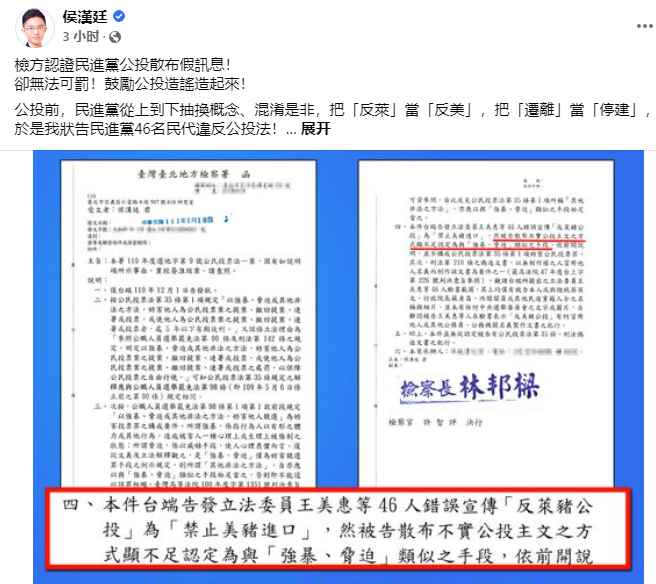 據侯漢廷在社交平台貼出的台北地檢署函文提到,“告發‘立委’王美惠等46人錯誤宣傳‘反萊豬公投’為‘禁止美豬進口’,然被告散佈不實公投主文之方式,顯不足認定為與‘強暴、脅迫’類似之手段……”。 對於檢方的說法,侯漢廷點出兩個荒謬: 荒謬一:法律無規定造謠要罰。對此,檢方坦承,民進黨確實“散佈不實公投主文”,但法律只罰“強暴脅迫”或“類似手段”,因此散佈不實資訊不罰。 荒謬二,檢方主動解釋造謠不屬違法。 侯漢廷表示,檢方坦承民進黨散佈不實資訊,但民進黨卻勝了公投,更是台灣民主的重大荒謬! 侯漢廷指出,檢方的解釋,等於助長造謠、鼓勵撒謊;未來公投,大家更加可以拼命信口開河、以訛傳訛,反正無法可罰! “檢方認證綠營公然造謠,卻無法可罰”消息一出,島內輿論瞬間炸鍋,網友在侯漢廷相關貼文下方紛紛留言,怒斥民進黨當局又搞“綠能,你不能”。 有不少島內網友表示,“社維法只罰非民進黨嗎?”、“整個政府都在鉆法律漏洞!”、“是無法可罰,還是不敢罰”、“造謠而不罰,如此如何導正視聽”……