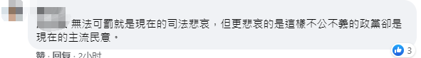 還有網友評論指:無法可罰就是現在(台灣)的司法悲哀,但更悲哀的是,這樣不公不義的政黨卻是現在的(台灣的)主流民意。
