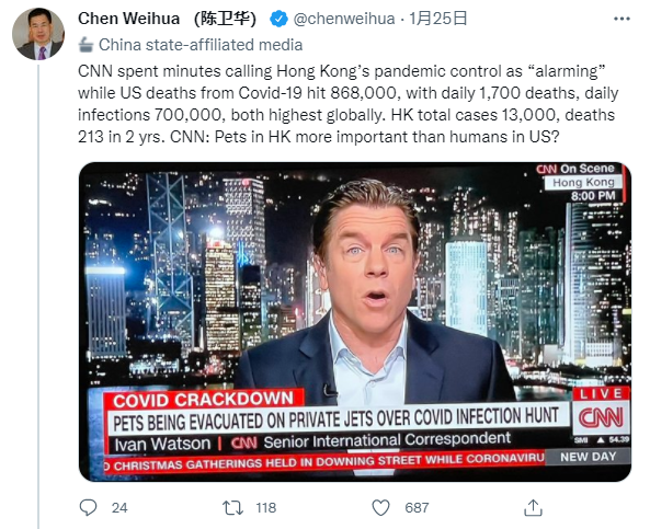 對於CNN近期反覆炒作港府人道毀滅倉鼠一事,中國日報社歐盟分社社長陳衛華也在社交媒體推特上直言:“CNN稱香港的措施之嚴格令人‘震驚’,殊不知美國已有約86萬人死於新冠,單日死亡人數1700,感染人數70幾萬。” 而香港兩年內的總感染病例才13000,死亡人數只有213人,“CNN的意思是說,香港的寵物比美國的人命重要?”陳衛華反問道。