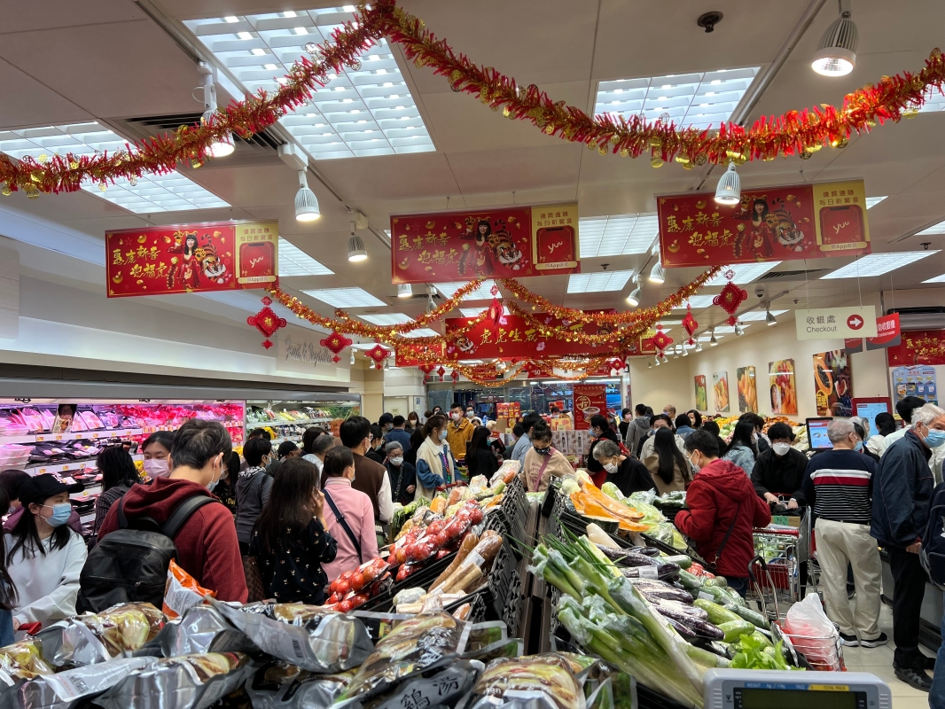 在一旁的陳女士看著買海鮮的人越來越多,要了一條東星斑,盛惠300港元,“今年這個海鮮真的貴了,有點買不下手,過年嘛,還是要吃好一點。” “港漂”李小姐和朋友也慕名前來採購海鮮打邊爐。老家在東北,這是李小姐第二年在香港過年,買一桌子海鮮花了800多港幣,“真的好貴啊,但又覺得還是挺劃算的,在東北很少吃海鮮,感覺是很名貴的食材。” 記者觀察,截至上午11點,很多海鮮攤檔的魚、蟹都已賣光。香港食品委員會主席吳永恩對記者說,香港人在過年早幾天就不會出海捕魚了,手上貨源賣出後就沒有存貨,加之因疫情貨運減少,市民居家開火需求量大,所以海鮮供不應求。因此也會有大概三四成的加價,年後這種情況就會結束。 香港各大超市更是在除夕一周前幾乎每天顧客爆滿,九龍城一家超市在周末迎來銷售高峰。負責補貨的售貨員說,一整天下來幾乎補了不下10次貨品,餃子、肉、菜,巡視一圈後,就被“洗劫一空”,寓意“生財”的生菜,兩顆就要26塊錢,但還是不停有市民採購。