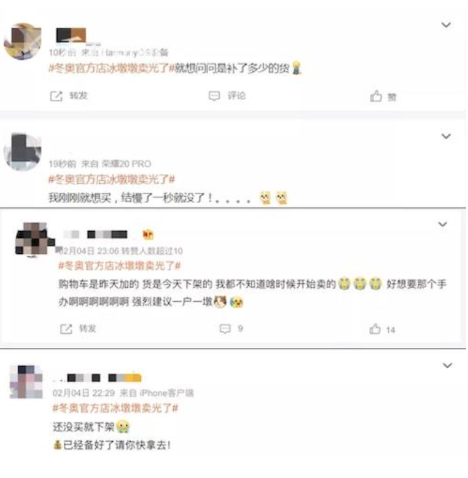(微博圖片) 如今已是超級網紅的“冰墩礅”,一墩難求!5日上午,在北京冬奧會主媒體中心的特許商品店內,“冰墩墩”的貨架已經被消費者買空。店內5分鐘一次補貨,但仍未跟上消費者的購買速度。 天貓方面透露,北京2022年冬奧會吉祥物“冰墩墩”造型手辦在電商平台的銷售十分火爆,1小時賣出1800件。截至2月3日,天貓奧林匹克官方旗艦店訪客數已突破百萬。2月4日,“冰墩墩”手辦上線15分鐘,5000個一掃而光。銷量最高的一款“冰墩墩”雪容融手辦玩具擺件銷量已經超過了6萬。 眾多微博網友都在線留言,表達了對“冰墩墩”喜愛的同時,求官方盡快補貨。