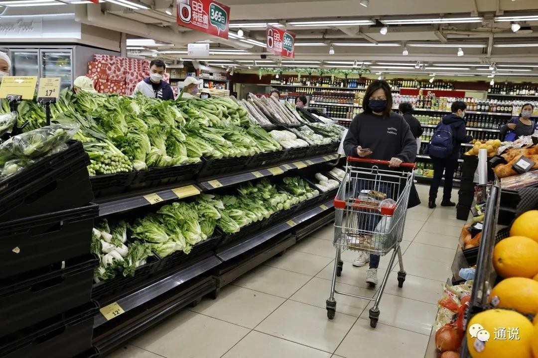 市民在元朗一個游樂場流動檢測中心做檢測 蔬菜供應恢復 因有跨境司機確診,一度導致內地供港蔬菜和鮮魚等食品供應量減少。但兩天時間內,蔬菜供應量恢復,超市滿滿當當的貨架總算讓港人安了心。一位老人在貨架前,饒有興致地比較兩根胡蘿蔔。