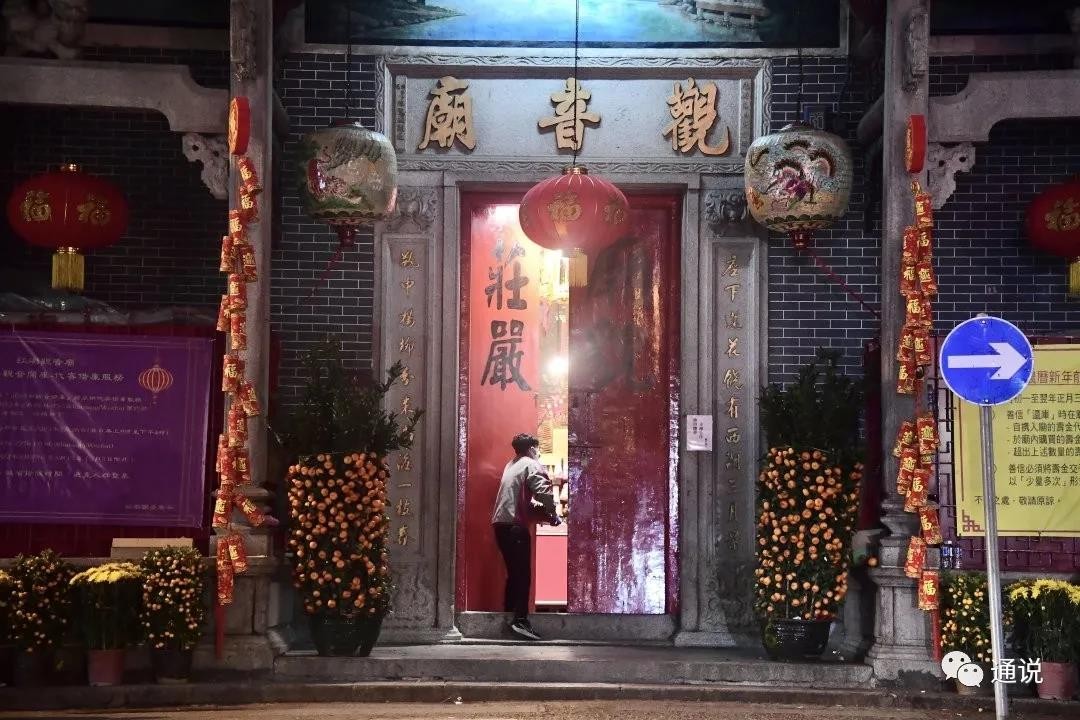 夜晚降臨,位於紅磡的一間觀音廟也緩慢關上了大門。最後一絲光線在門縫中戛然而止的時候,“莊嚴”二字赫然顯現。疫情下,佛祖觀音也要謝客。