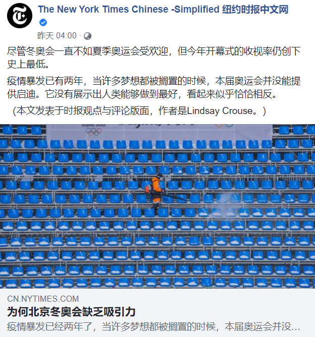 “紐約時報中文網”報道截圖 該文章還將北京冬奧會上採用的一系列高新科技等羅列出來“尬黑”。從中國利用綠色資源製造的、更為適合比賽使用的人造雪,到冬奧村裡調製雞尾酒、的機器人……這些運用高科技以造福運動員的舉動,在美媒看來則是構成一個所謂“反烏托邦的奧運會”。 北京冬奧會上以保護所有人生命健康為出發點的嚴格防疫措施,也被納入所謂“反烏托邦”的要素。該文章陰陽怪氣地寫道,冬奧會的“穿的不是運動服,而是防護服。沒有一票難求的體育場館,只有一個你的‘泡泡’”。 文章最後還聲稱,奧運會的激勵人心,追求不可能實現的夢想。但因為因為新冠疫情,“許多夢想都被擱置”……文章就此下結論,抹黑稱北京奧運會“並沒能提供那種啟迪”。 “紐約時報中文網”從一個“新奇”的角度攻擊北京冬奧會,卻無法掩蓋此次體育盛事在全球獲得的吸引力與關注度。 奧林匹克轉播服務公司(OBS)2月10日在新聞發佈會上表示,北京冬奧會已經成為迄今收視率最高的一屆冬奧會,在轉播時長、技術、內容製作方式等多方面都書寫了新紀錄。 OBS首席執行官伊阿尼斯·埃克薩科斯還指出,根據相關數據,在美國全國廣播公司旗下的數字平台上,北京冬奧會也成為收視率最高的一屆冬奧會。 與此同時,北京冬奧會亦獲得了多國運動員的贊美和肯定。各國運動健兒們在賽場上突破自我,實現夢想;賽場下則積極通過視頻分享在奧運村的各種美好體驗。在各種贊美與好評面前,“紐約時報中文網”所謂的北京奧運會“未能提供那種啟迪”的言論,更顯得荒謬與可笑。 “睜眼說瞎話,顛倒黑白!”對於“紐約時報中文網”罔顧事實的抹黑言論,網友們紛紛在評論區嘲諷: “最高收視率變成最低了!”“很好,就這樣繼續下去,造謠上癮了......” “紐約時報不要臉程度創歷史新高!”有網友諷刺美媒。 還有網友揶揄稱,美媒天天“尬黑”中國其實是給北京冬奧做宣傳,直指此次冬奧收視率好也離不開反華群體的嚷嚷,“你們越這樣造謠惑眾,反而讓更多人關注冬奧了。”