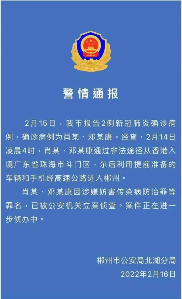 活動軌跡顯示,上述二人2月14日凌晨4時從香港坐船,早上5至6時左右到達廣東省珠海市斗門區;6時左右兩人從珠海自行駕駛私家車,經樂廣高速於當日16時左右從郴州西高速出口駛出;16時21分兩人自駕到郴州市第一人民醫院南院進行核酸檢測。 此外,有兩名偷渡者到廣州後確診,二人分別為21及23歲女性,曾到天河區太古匯LV、DIOR等名店,以及長隆歡樂世界。太古匯、長隆封閉消毒。
