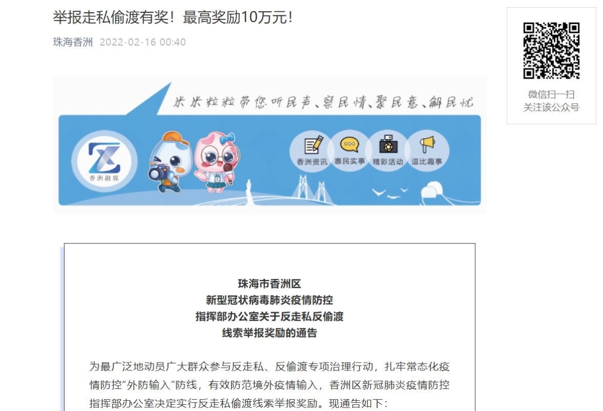 15日,珠海市香洲區新型冠狀病毒肺炎疫情防控指揮部辦公室發出關於反走私反偷渡線索舉報獎勵的通告,為最廣泛地動員廣大群眾參與反走私、反偷渡專項治理行動,紥牢常態化疫情防控“外防輸入”防線,有效防範境外疫情輸入,香洲區新冠肺炎疫情防控指揮部辦公室決定實行反走私偷渡線索舉報獎勵,最高獎勵10萬元人民幣。(完) 【編輯:黎金良】